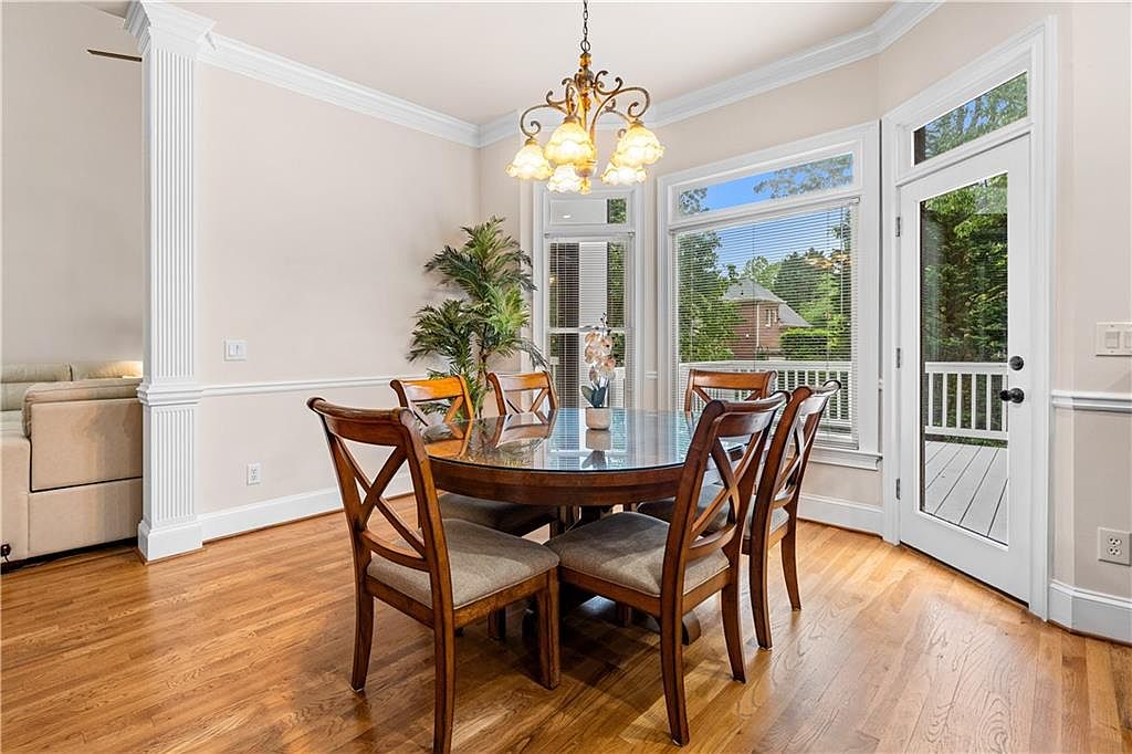 This elegant dining area features a classic round wooden table surrounded by six matching chairs upholstered in neutral fabric, offering comfortable seating. The rich wood flooring adds warmth and contrasts beautifully with the soft beige walls and crisp white trim, which includes sophisticated molding and a decorative column. Ample natural light pours in through large windows fitted with blinds, enhancing the bright and airy ambiance. A glass door opens to an outdoor deck, inviting nature inside. A graceful chandelier with multiple lamps casts a warm glow, while a potted plant adds a touch of greenery to the space.