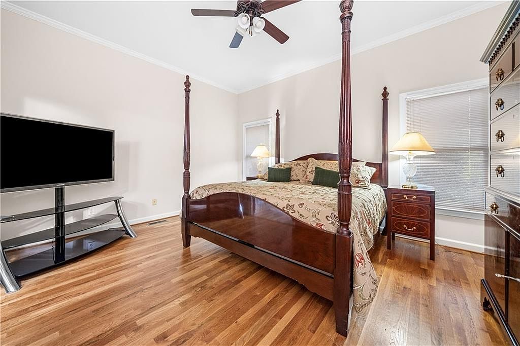 This master bedroom features a classic and elegant design highlighted by a rich, dark wood four-poster bed positioned centrally against a neutral beige wall. The bed is adorned with a floral patterned bedspread in muted earth tones, complemented by two green accent pillows. Hardwood floors with a warm, natural finish add warmth and balance the room’s clean white baseboards and ceiling trim. Flanking the bed are matching dark wood nightstands, each topped with a traditional glass lamp emitting soft, ambient light. A large flat-screen TV sits on a modern glass stand, blending old-world charm with contemporary convenience. Two windows with white blinds provide natural light and privacy, enhancing the room’s bright and inviting atmosphere. A ceiling fan with light fixtures completes the comfortable setup.