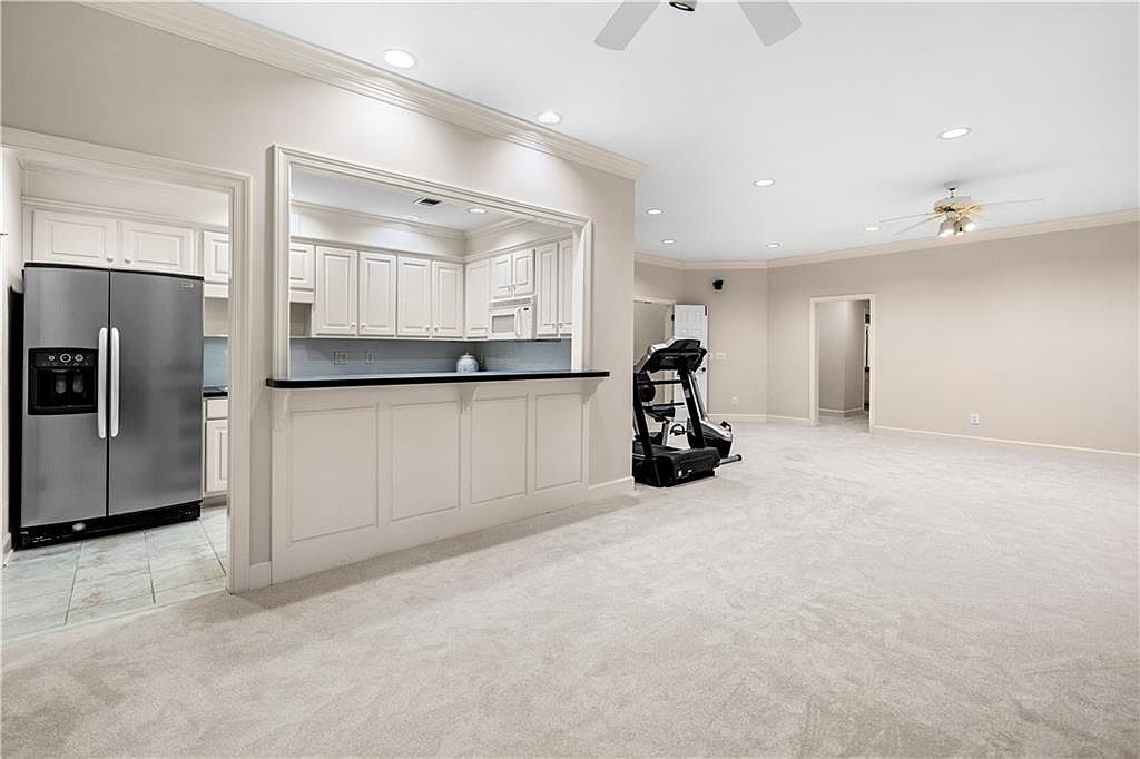 This spacious open floor plan combines a cozy living area with a partial view into the kitchen, separated by a half-wall topped with a black countertop bar. The kitchen features classic white cabinetry and stainless steel appliances, including a large side-by-side refrigerator. The neutral color palette of soft beige walls and plush light carpeting evokes a calm, inviting atmosphere. Recessed lighting and ceiling fans contribute to the bright and airy feel of the space. The room’s minimalist design allows versatility, enhanced by the presence of a treadmill along one wall, suggesting a multifunctional living space.