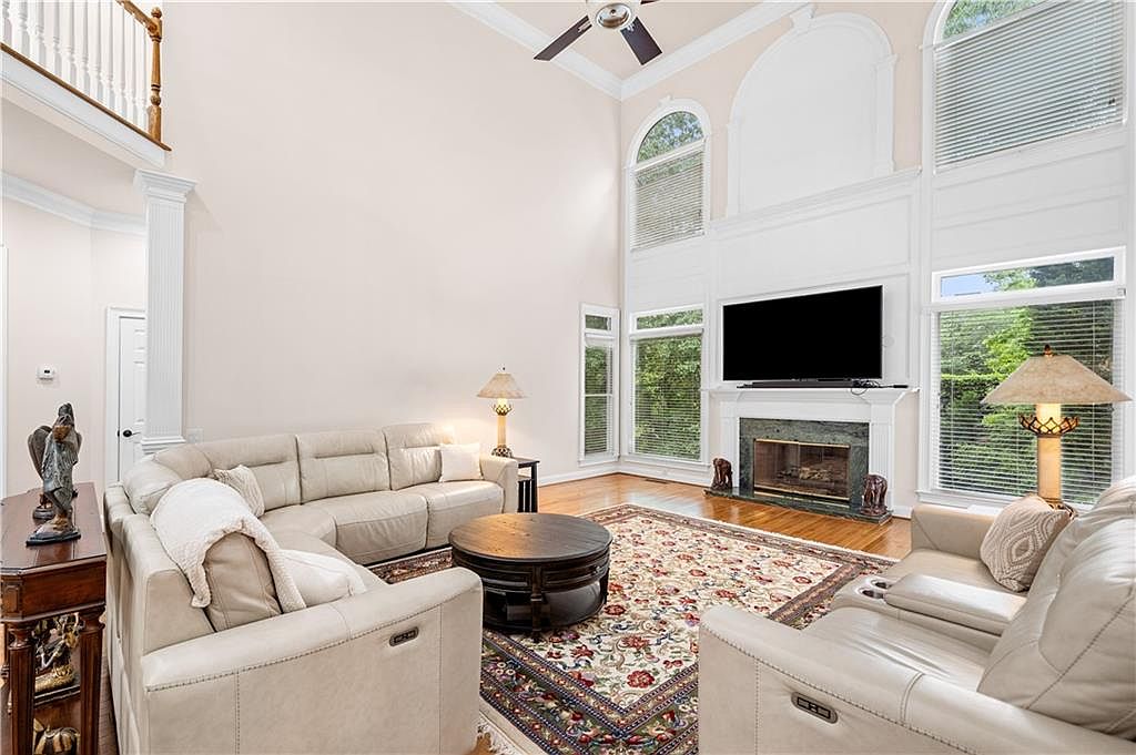 This spacious living room impresses with its soaring vaulted ceilings and an abundance of natural light streaming through tall, arched windows. The neutral cream walls create a soft backdrop that complements the light beige leather sectional and recliner seating. A traditional patterned area rug adds warmth and color underfoot, contrasting with the sleek hardwood floors. The focal point is a neatly framed fireplace topped by a mounted flat-screen TV, flanked by large windows with white blinds. Classic crown molding and a ceiling fan add architectural detail and comfort to the inviting, airy space designed for relaxation and entertainment.