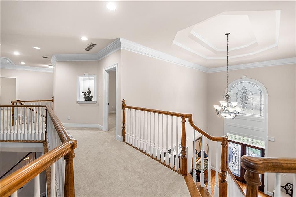 This upstairs hallway features a neutral color palette with soft beige walls and plush carpeting that extends along the walkway. White crown molding and baseboards add an elegant contrast to the warm wooden handrails that border the staircase and hallway edges. The space is illuminated by recessed ceiling lights and a decorative chandelier hanging from an octagonal ceiling recess, enhancing the open and airy feel. A built-in niche showcasing a small sculpture adds a refined detail, while the large stained glass window by the staircase introduces artistic charm and natural light to the entry area below.