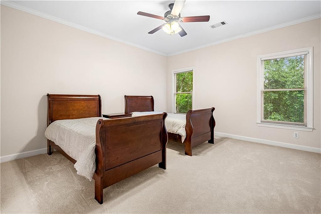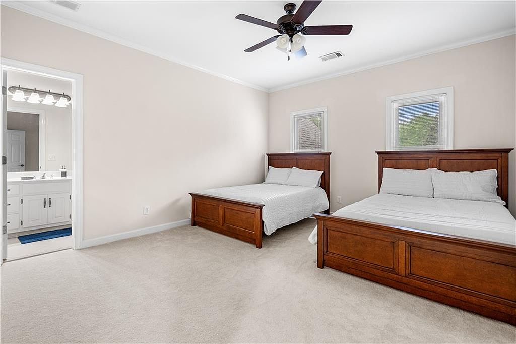 This spacious bedroom features two classic wooden beds with matching headboards and footboards, providing a balanced and inviting sleeping area. The room’s neutral palette of soft beige walls and light carpet creates a calm, airy ambiance. Two large windows allow natural light to enhance the fresh and clean atmosphere. A ceiling fan with dark blades and light fixtures offers both style and functionality. The adjoining bathroom is visible through an open doorway, showcasing a large vanity with white cabinetry and chrome fixtures, reinforcing the bright and simple aesthetic throughout the space.