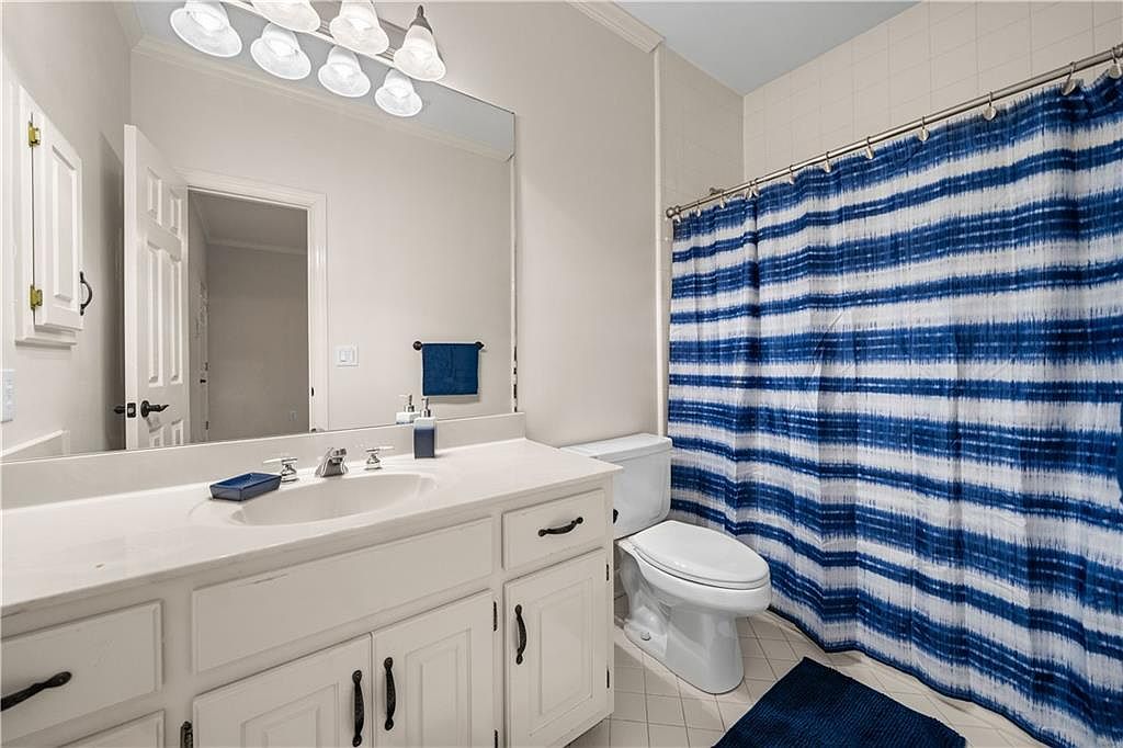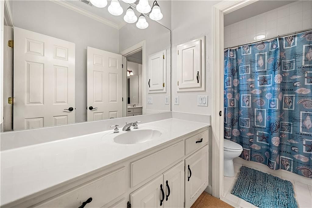 This bathroom features a clean, bright layout dominated by white cabinetry and countertops, creating a fresh and airy feel. The vanity extends with a single integrated sink and a wide mirror, enhancing the space visually. Black hardware on the cabinets and doors offers a subtle contrast. A set of white lights above the mirror provides ample illumination. The adjoining shower area displays a blue-themed curtain decorated with seashell and marine motifs, paired with a textured blue bathmat, adding a coastal touch that brings warmth and personality to the otherwise neutral palette.