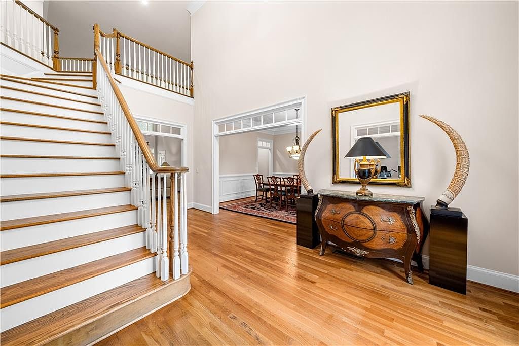 This inviting entry foyer features a warm, natural hardwood floor that extends through the space, complementing the white and wood-toned staircase with classic turned balusters and a polished wood handrail. The staircase ascends to an open upper hallway, creating a spacious and airy feel. To the side, a rich wooden chest with elegant curved details and silver accents anchors the room, topped with a black and gold lamp and positioned in front of a large, framed mirror. Two sculptural tusk-like decorations sit on black pedestals flanking the chest, adding artistic interest. An open doorway with transom windows leads into a formal dining room, enhancing the home’s traditional elegance through its white trim and chandelier-lit space.