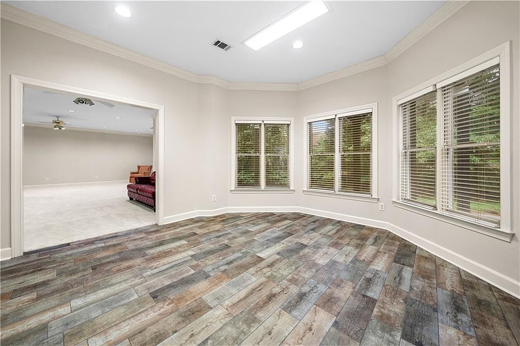 This bright, open sunroom or sitting area features a distinctive flooring composed of wide planks in varied shades of gray, beige, and muted blue, adding a rustic yet modern touch. The off-white walls and ceiling create a clean, airy atmosphere complemented by multiple large windows that wrap around the corner, allowing ample natural light and views of the greenery outside. Crown molding adds subtle elegance to the otherwise minimalist space. The area opens into a larger, carpeted room with neutral tones, accentuated by cozy seating and subdued ceiling fan lighting, perfect for relaxation or casual gatherings.