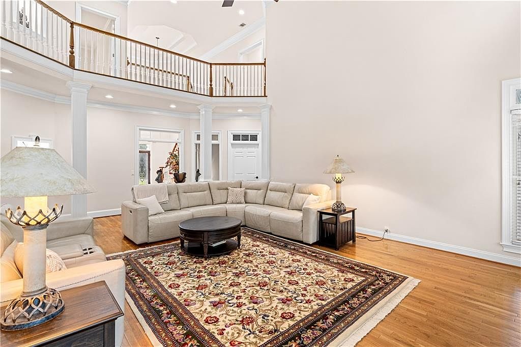 This spacious living room features an open floor plan with soaring ceilings and a graceful second-story balcony overlooking the space. Soft neutral walls complement the warm honey-toned hardwood floors, creating a welcoming atmosphere. The seating arrangement centers around a large, light gray sectional sofa paired with a matching armchair. A traditional, richly patterned area rug anchors the seating area, adding a touch of elegance and color with its intricate floral design in reds, golds, and greens. Classic architectural details are highlighted by tall white columns and recessed lighting, while wooden handrails provide contrast and warmth.