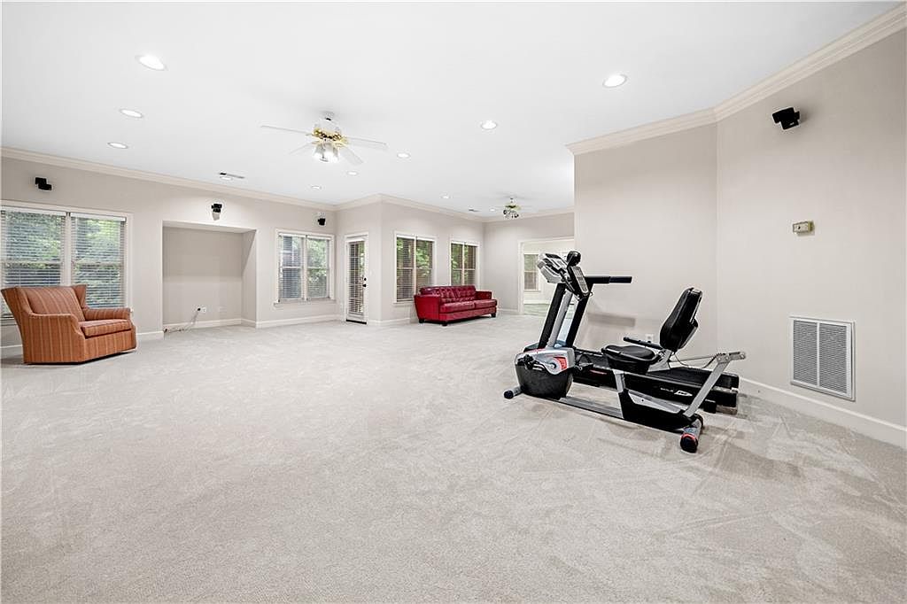 This spacious recreation room offers versatile usage with a focus on leisure and fitness. Neutral beige walls and light carpeting create a bright, airy atmosphere heightened by ample natural light streaming through multiple windows. The room features a ceiling fan and recessed lighting for temperature control and illumination. Furnishings include a single orange armchair and a red leather sofa that add subtle color contrasts. A recumbent exercise bike anchors one side for workout convenience. The room’s open layout and clean architectural lines provide an inviting space adaptable to family entertainment, exercising, or relaxation.