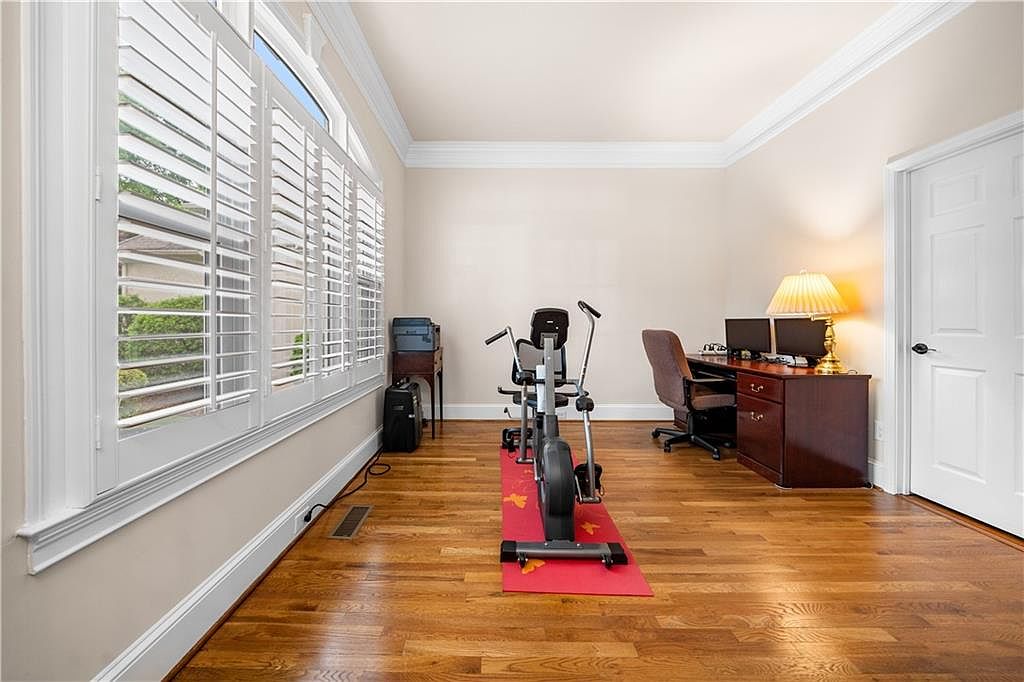 This room offers a dual-purpose layout blending a work-from-home office with an exercise area. Natural light floods in through large white plantation shutters that line one wall, highlighting warm honey-toned hardwood floors. On the far side, a rich mahogany desk with a matching swivel chair and brass lamp creates a traditional and functional workspace complete with a dual monitor setup. The opposite side features an exercise bike on a vivid red mat for workouts. Soft beige walls accented by white crown molding offer a calm, neutral backdrop conducive to both productivity and fitness.