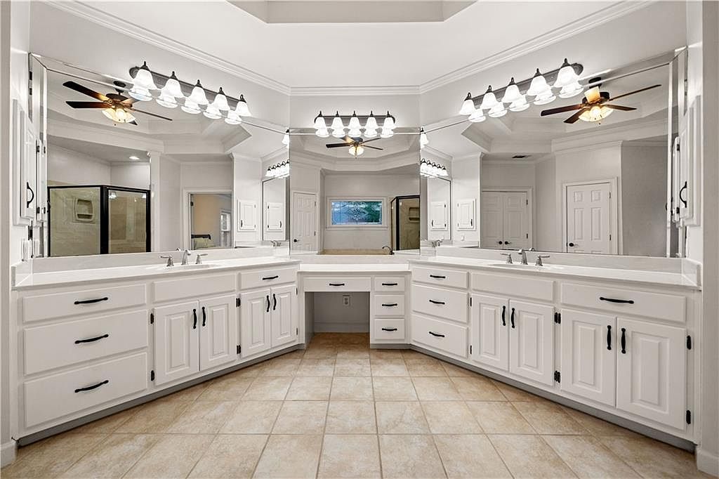 This bathroom vanity area features an expansive dual-sink countertop arranged in a wide U-shape, providing ample space for two users simultaneously. Classic white cabinetry with black hardware contrasts elegantly against the beige tile flooring, lending a timeless and clean aesthetic. The large, corner-wrapped mirrors extend to the ceiling, enhancing the sense of spaciousness and reflecting light from the multiple vanity light fixtures mounted above, which include two sets of five clear glass shades. Ceiling fans with warm lighting contribute to comfort and a touch of traditional style. The neutral color palette and practical layout combine functionality with understated elegance.