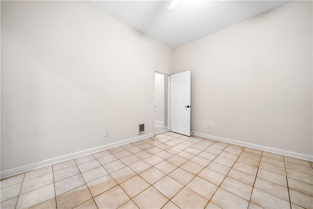 This room features a simple yet clean design with beige ceramic tile flooring arranged in a grid pattern, creating a practical and easy-to-maintain surface. The walls are painted in a soft off-white color, contributing to a neutral and bright ambiance. White baseboards outline the room’s perimeter, adding a subtle architectural detail. A white six-panel door with black hardware opens inward, leading to an adjacent space with similar tile flooring visible through the doorway. The ceiling is white with a mounted light fixture and a ceiling fan, hinting at both illumination and ventilation options in this versatile, undecorated room.