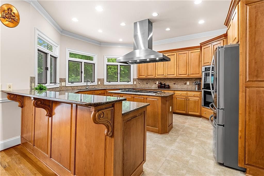 This spacious kitchen features a warm, inviting design with extensive wooden cabinetry in a natural finish that adds a classic touch. The large central island, topped with polished granite, serves as both a workspace and a casual dining area, supported by intricately carved corbels that enhance the traditional aesthetic. Stainless steel appliances, including a modern refrigerator and built-in double oven, complement the space alongside a sleek, stainless steel range hood above the cooktop. Multiple windows let in natural light, highlighting the beige tile flooring and neutral-toned backsplash that unifies the area’s cozy and functional atmosphere.