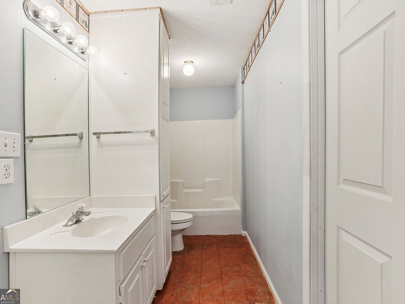 This bathroom features a narrow layout with a single white vanity cabinet topped by a smooth countertop and an inset sink. Above the vanity, a large mirror is bordered by four globe lights, providing bright illumination. Adjacent to the vanity, a tall white storage cabinet offers added functionality. The walls are painted a calm, muted blue-gray shade, adding a soft contrast against the white fixtures. The flooring consists of reddish-brown tiles that introduce warmth to the space. The bathtub and toilet sit at the far end, with a simple white tub surround and a modest ceiling light, creating a clean and practical bathroom design.