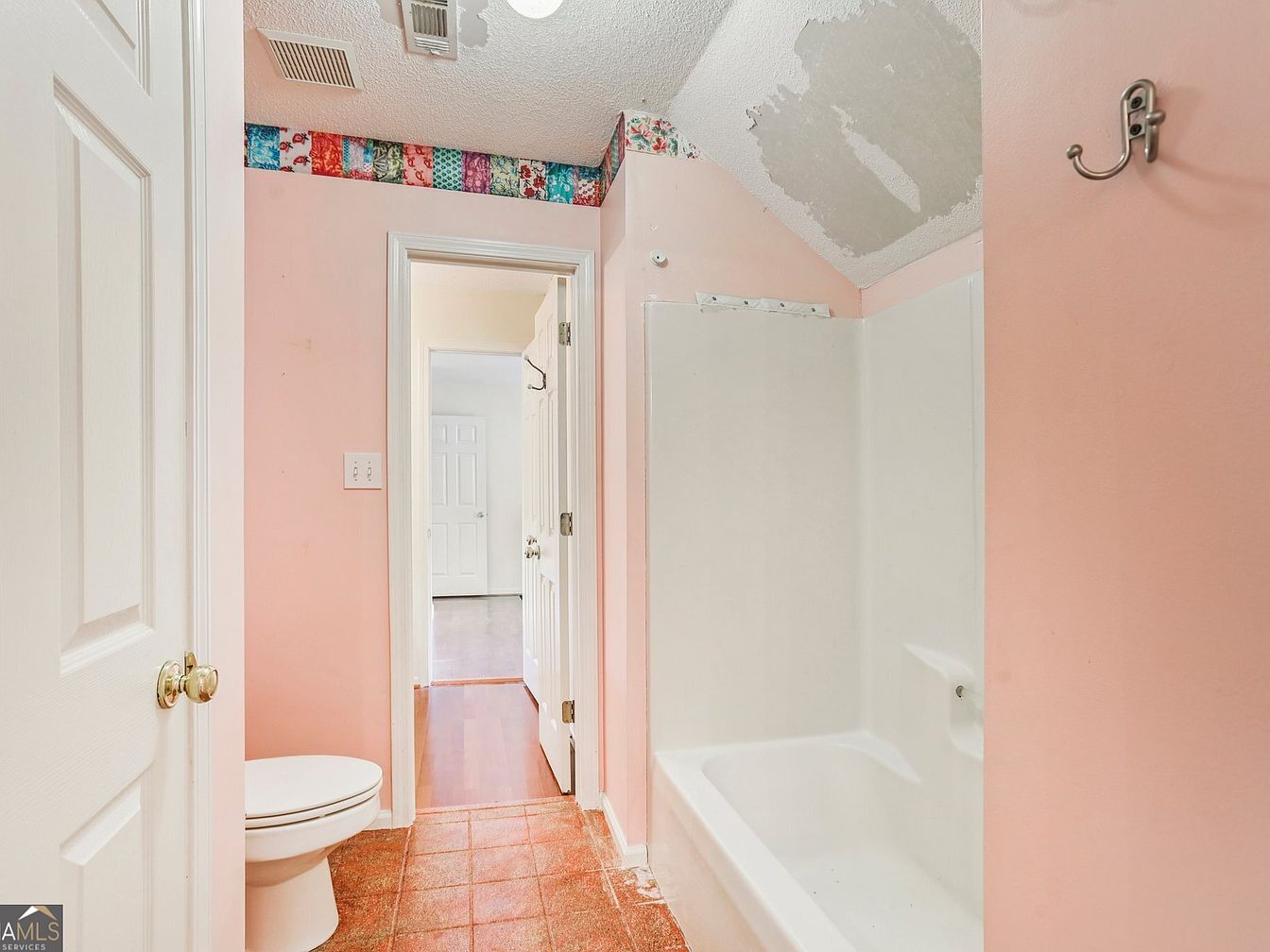 This compact bathroom features soft pink walls paired with a white bathtub and toilet, creating a gentle yet vibrant palette. The terracotta floor tiles add warmth and contrast to the space. A patchy ceiling shows signs of wear, hinting at needed repairs, while a colorful mosaic border runs along the upper perimeter, injecting an eclectic and playful character. The door view reveals a glimpse of an adjacent room with darker hardwood floors, enhancing the layered feel of the home’s layout. Minimalist fixtures like a single hook emphasize simplicity amidst details.