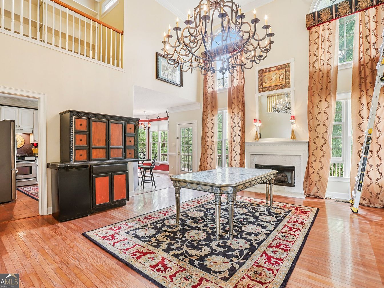 The formal dining room features soaring ceilings and expansive windows, allowing abundant natural light to enhance the warm ambiance. A large, ornamental wrought-iron chandelier hangs centrally above a silver-accented dining table, which rests on an intricately patterned area rug combining deep reds, golds, and blacks. Tall, floor-length curtains with elegant embroidery frame the windows, adding sophisticated touches. The white marble fireplace beneath a sizable mirror is flanked by wall sconces with red lampshades, creating a balanced focal point. The hardwood floors complement the traditional black and reddish wood cabinetry visible near the adjoining kitchen, with an open layout seamlessly connecting the spaces.