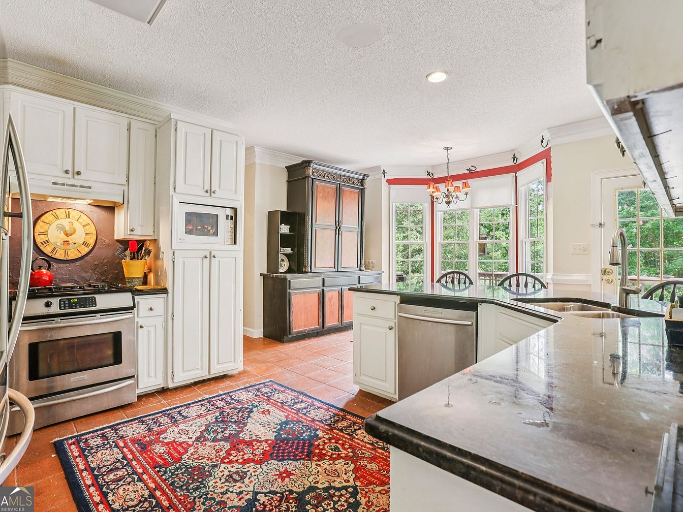 This kitchen features a warm and inviting layout with white cabinetry and stainless steel appliances, including a stove and dishwasher. The countertops are dark granite, creating a striking contrast with the cabinets. A large, patterned area rug anchors the space, adding rich reds and blues to the earthy terracotta tile floor. The adjoining breakfast nook is framed by tall windows that flood the space with natural light, highlighted by a charming chandelier with red lampshades. A distinctive black and wood-toned cabinet with gold detailing adds character, while the red trim around the windows introduces a pop of color that energizes the space.