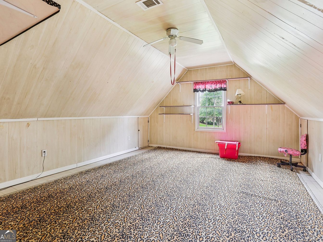 This upstairs bonus room features angled walls and ceilings clad in light, natural wood paneling that creates a cozy, attic-like atmosphere. The room is illuminated by a single large window with a small pink valance, allowing natural light to brighten the space. A ceiling fan with a simple white finish hangs centrally, enhancing airflow. The floor is covered in a bold leopard-print carpet that adds a striking contrast and whimsical touch. Minimal furnishings include a small pink office chair, a bright red storage bin, and wall-mounted shelves that offer potential for personalized decor or storage.