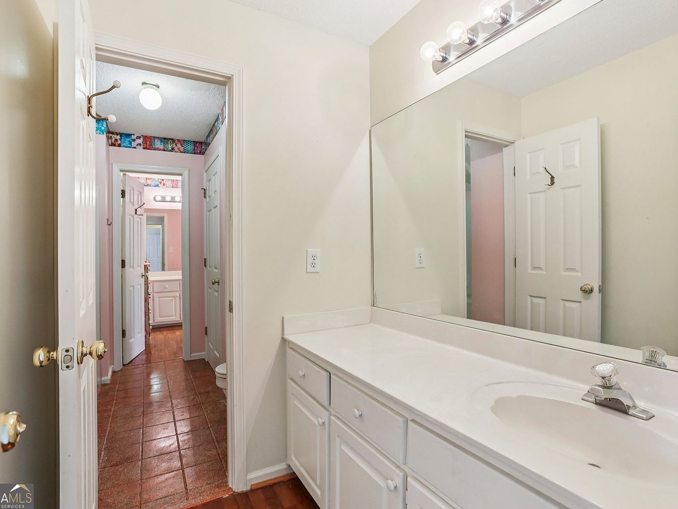The space features a clean white bathroom vanity with a long countertop, integrated sink, and multiple cupboard doors providing ample storage. Above the vanity, a large mirror spans the length of the counter, reflecting the adjacent hallway. The walls are painted a soft, neutral cream, contributing to a bright and fresh ambiance. The hallway beyond is lined with terracotta-colored tiled flooring leading to another bathroom space with pink walls and decorative patchwork wallpaper border near the ceiling. White six-panel doors with brass and white ceramic hardware add subtle traditional charm to the transitional area.