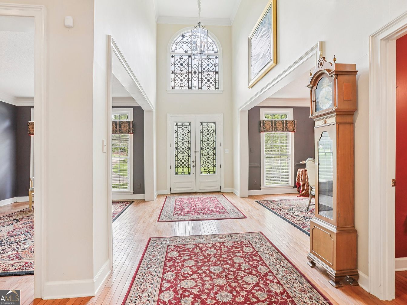 This entryway foyer features a tall ceiling with a large, arched window above the double front doors, both adorned with decorative wrought iron inserts, allowing natural light to fill the space elegantly. The light wood flooring is complemented by traditional area rugs in rich red tones with intricate patterns, creating warmth and classical style. The walls are painted a soft, neutral shade that brightens the space, while dark gray receptions on either side offer views into adjoining rooms with large windows and detailed valances. A stately grandfather clock adds timeless sophistication alongside clean white molding and trim. The overall ambiance is inviting, refined, and balanced with traditional charm.