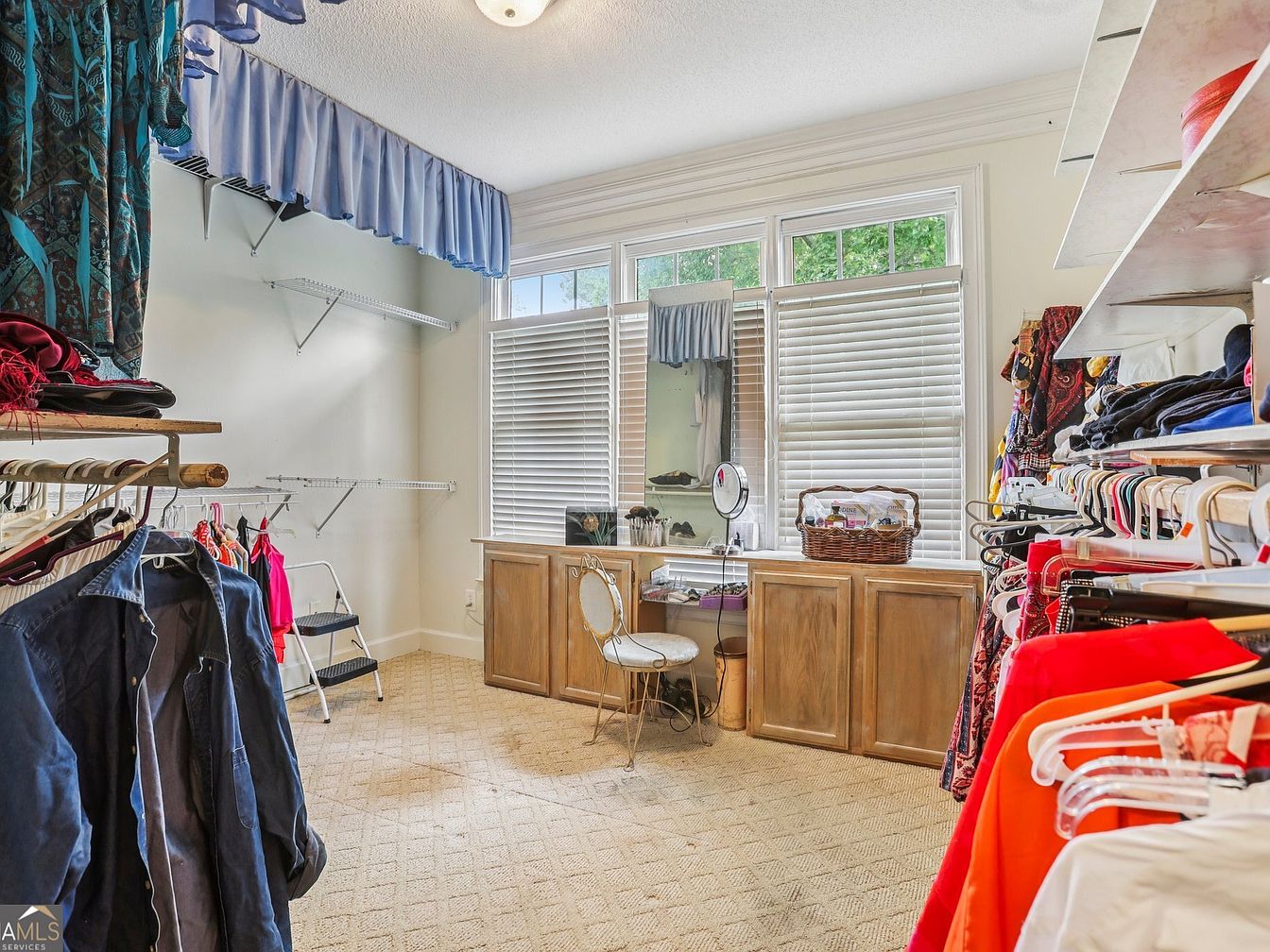 This spacious walk-in closet features an organized layout with open shelving and hanging rods on both sides, maximizing storage for clothing. The carpeted floor sports a subtle diamond pattern, adding texture and warmth. Natural light filters through large triple windows adorned with white blinds and a blue valance that introduces a soft color accent. Below the windows, a light wood built-in vanity with cabinets offers functional storage and a cozy sitting area with a vintage-inspired metal chair. The mirror and small vanity mirror create a dedicated space for dressing and makeup, combining practicality with homey charm.