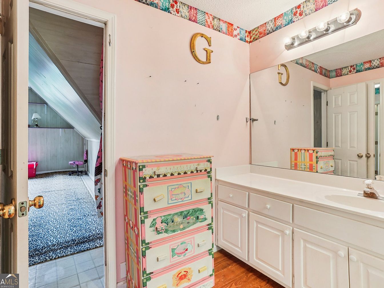 This bathroom features a spacious white vanity with multiple drawers and cabinet doors beneath a large wall-to-wall mirror, reflecting ample light from the vanity bulbs above. The walls are painted a soft pink, complemented by a colorful floral and geometric wallpaper border running along the ceiling edge. A whimsical hand-painted chest with pastel hues and nature motifs adds a unique, artistic touch. Wood flooring extends into the bathroom, while a room with slanted ceilings and a patterned carpet can be seen through an adjacent open door, creating a cozy, eclectic contrast.