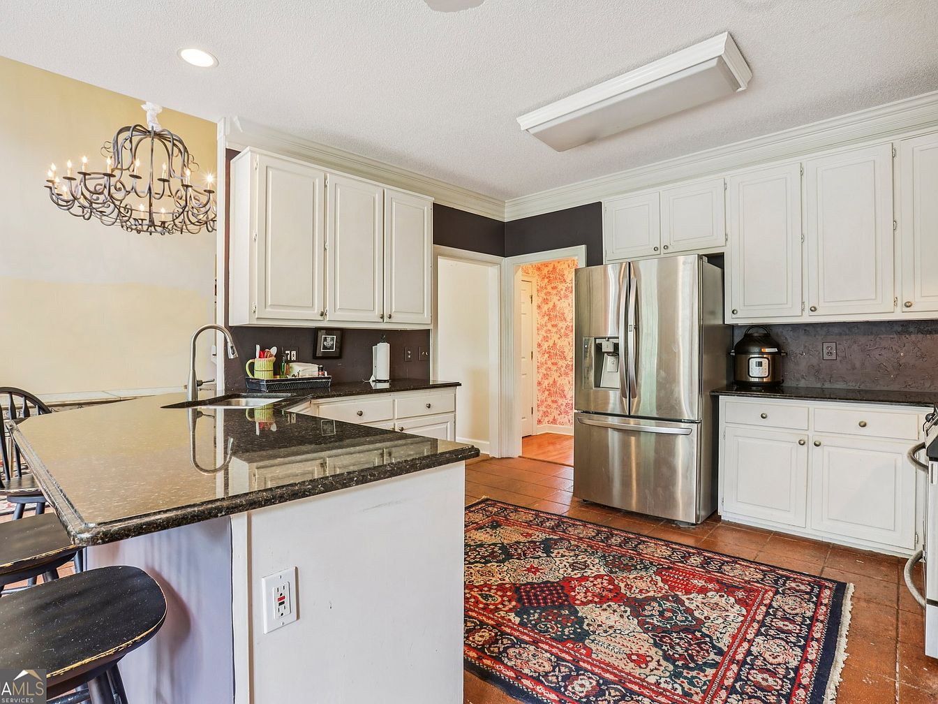 This kitchen features a spacious black granite countertop island with an integrated sink and modern stainless steel faucet. The island is paired with matte black wooden stools, creating an inviting casual dining or seating area. White cabinetry with classic panel detailing runs along the walls, complemented by a deep charcoal backsplash and wall paint that adds contrast to the light cabinetry. A stainless steel refrigerator and modern appliances enhance the functional appeal. Warm terracotta floor tiles and a richly patterned red, navy, and cream area rug add color and texture. A wrought iron chandelier above the island introduces a rustic, elegant touch.