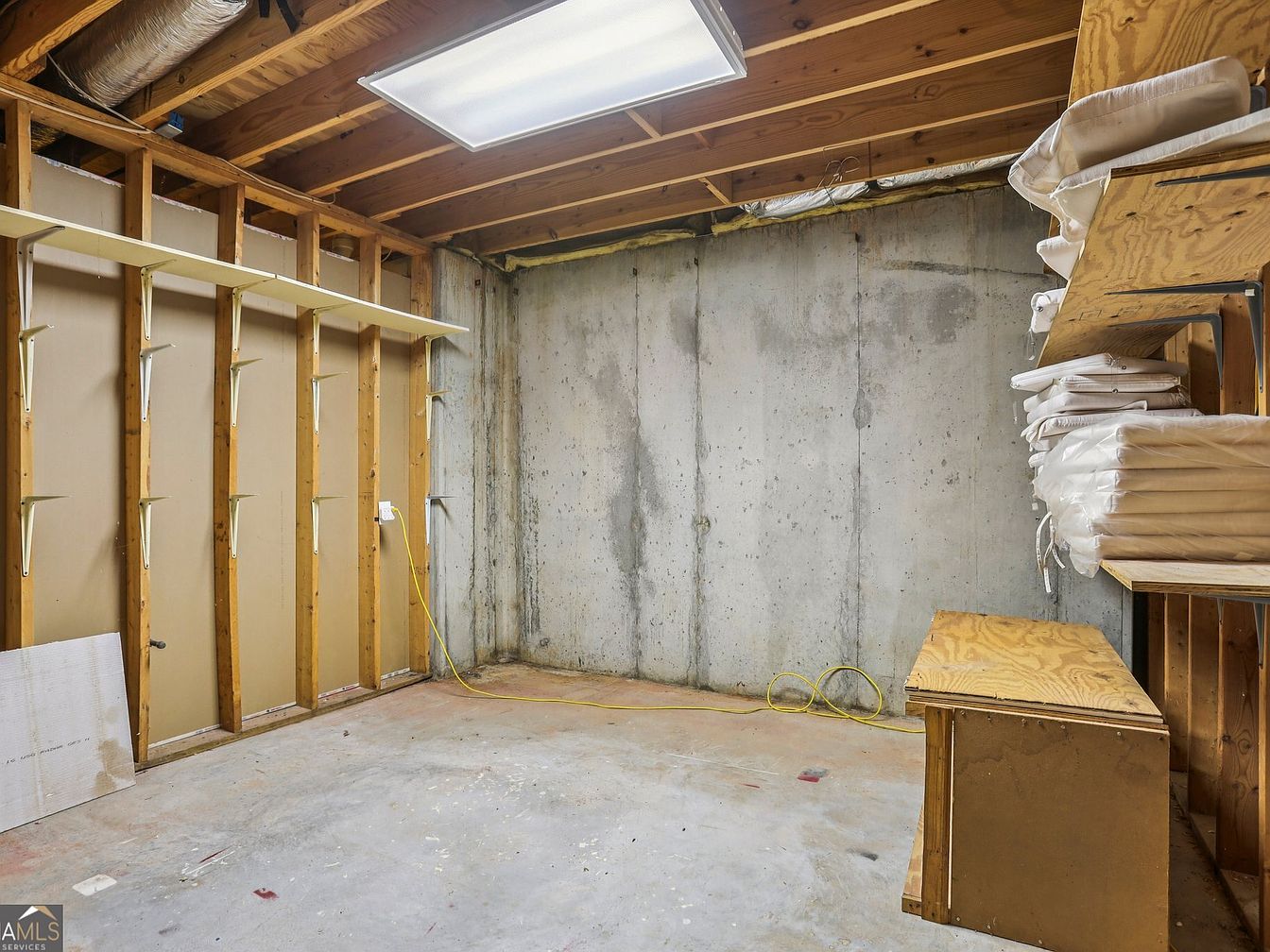 This unfinished basement storage area features exposed wooden framing and concrete walls, highlighting its raw and utilitarian character. The ceiling reveals open wooden joists and ductwork, with a large fluorescent light fixture providing ample overhead illumination. On the left wall, multiple slender shelves are attached, offering vertical storage space, while the right side hosts sturdy plywood shelving holding neatly stacked cushions or padding. The cement floor is bare, contributing to the industrial feel. A yellow extension cord snakes along the floor, adding a touch of practicality to the space. Overall, it’s a functional, work-in-progress area suited for organizing household items.