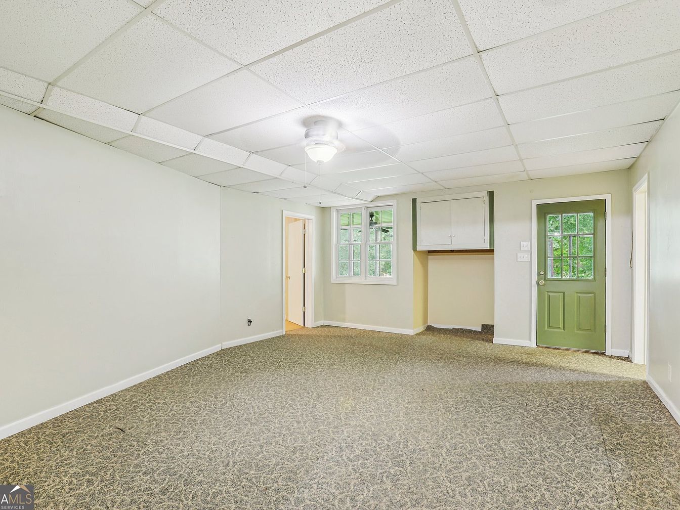 This basement recreation room features a spacious layout with neutral, off-white walls that brighten the area despite limited natural light. The ceiling is composed of white, square acoustic tiles arranged in a grid pattern, paired with a centrally mounted ceiling light and fan. The flooring is covered in a patterned beige and gray carpet that adds texture while maintaining a subdued color palette. A green door with window panes offers an exterior exit, complementing the similarly framed multi-pane windows that bring in greenery views. Built-in storage cabinets with white and muted green accents provide practical use while maintaining simple, functional aesthetics.
