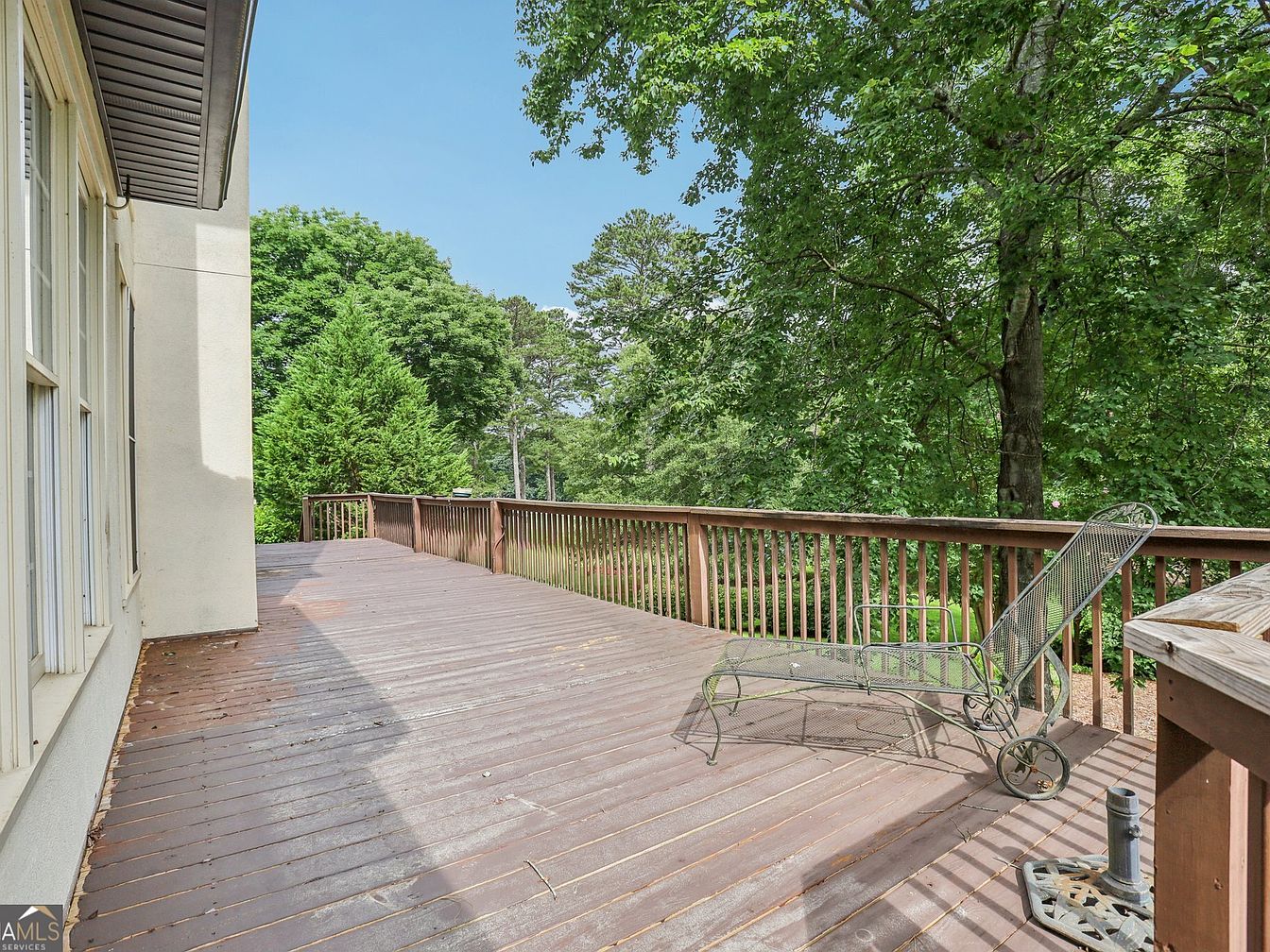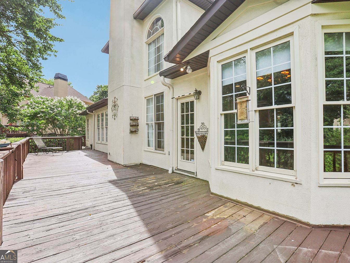 This expansive outdoor deck features weathered wooden planks that add a rustic charm to the space, extending along the rear of the home. The cream-colored exterior walls with large, grid-style windows create a bright and airy connection between the indoors and outdoors. Decorative wrought iron wall accents and a hanging bird feeder introduce subtle character, while a single lounge chair at the far end invites relaxation. Surrounded by lush greenery and mature trees, the deck offers a peaceful retreat ideal for outdoor gatherings and basking in natural light under a clear blue sky.