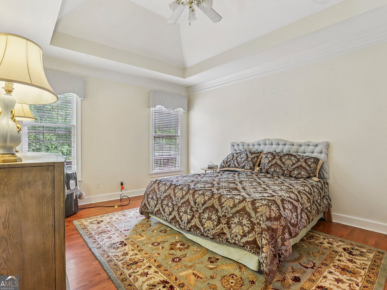 This master bedroom features a vaulted ceiling with tasteful crown molding, offering a sense of spaciousness and elegance. The walls are painted in a soft, neutral cream tone that enhances natural light pouring through two large, white-trimmed windows adorned with subtle gray valances. The bed stands out with a tufted, pale gray upholstered headboard complemented by a richly patterned brown and beige floral comforter. Beneath the bed, a large area rug with warm gold, red, and cream hues anchors the space, adding texture and color. Hardwood flooring and matching bedside furniture complete the refined, cozy ambiance.