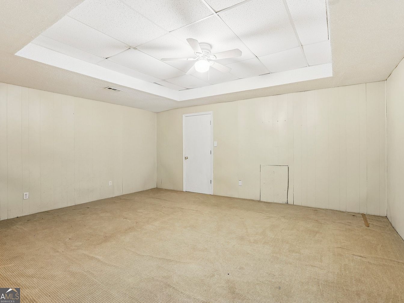 This basement space features beige walls with vertical paneling and a matching, low-pile beige carpet floor that covers the entire room. The ceiling has a drop design with white acoustic tiles, some showing slight discoloration or damage, and a white ceiling fan with a light fixture centrally positioned. A single white door stands on one wall, accented with a brass door knob. Various electrical outlets and vents are visible, highlighting the room’s functional simplicity. Despite its current empty state, the neutral palette sets a blank canvas ideal for customization and improvement.
