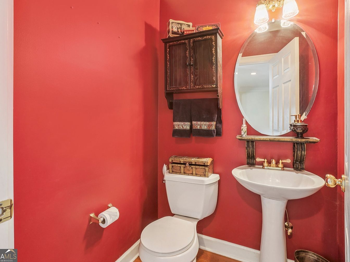 This intimate powder room features vibrant red walls that create a bold, warm atmosphere contrasting with classic white trim and fixtures. A sleek white pedestal sink is paired with brass hardware, lending a vintage charm alongside a large round mirror. The space is enhanced by a dark wood wall cabinet with ornate detailing and a small shelf above the sink, offering storage and display opportunities. Subtle decor accents, including a wooden box on the toilet tank, rich dark towels, and warm-toned lighting, contribute to an inviting, elegant aesthetic in a compact footprint.