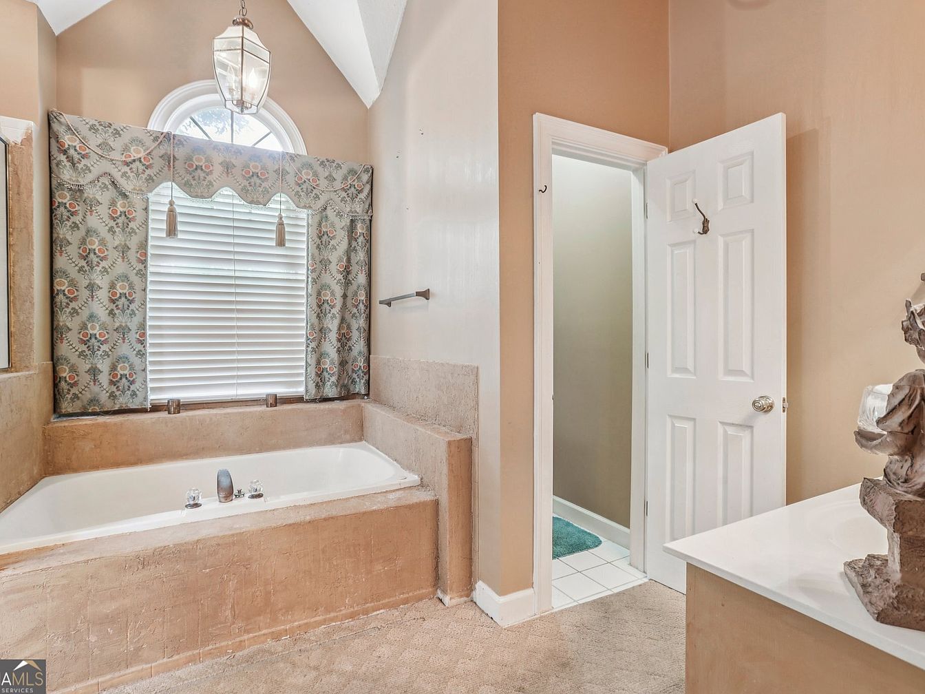This bathroom features a built-in rectangular bathtub set against a textured, earthy-toned surround that blends seamlessly into the beige walls, creating a warm and inviting atmosphere. Above the tub, an arched window with white blinds is dressed with patterned fabric valances that include soft blue and pink floral motifs, adding a vintage charm. The space is softly illuminated by a geometric pendant light hanging from a vaulted ceiling, enhancing the room’s elegance. The adjacent white door leads to a tiled area with teal bath rugs, while a white countertop with a sculptural decorative piece adds a touch of artistic flair to the room.