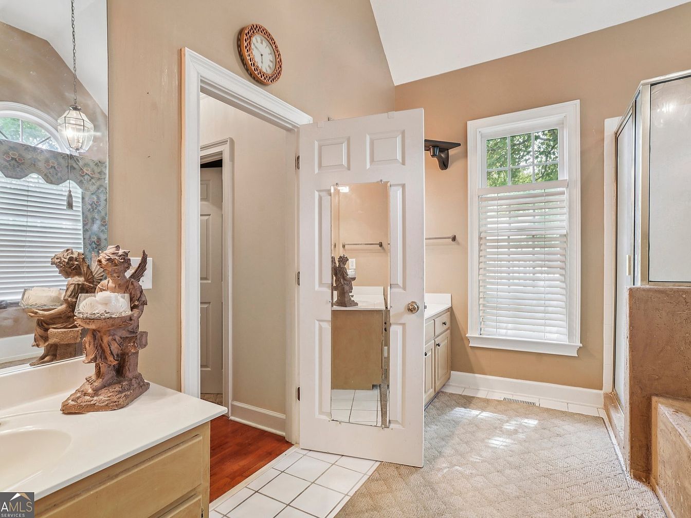 This bathroom features a warm, beige color palette highlighted by white trim and fixtures that create a soft, inviting atmosphere. The space includes a vanity with a large mirror and a distinctive decorative angel-like sculpture holding candles, adding a unique artistic touch. A white door with a vertical mirror enhances functionality, while natural light filters through a window dressed with white blinds and classic trim. The flooring transitions from white tile near the vanity to plush beige carpeting around the shower area, which is framed in textured stone and glass, giving a cozy yet elegant feel.