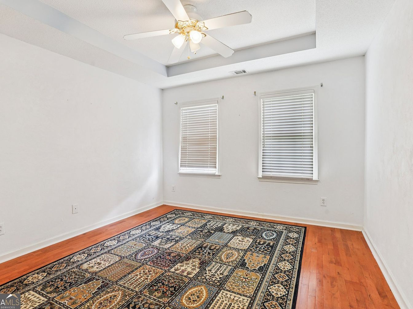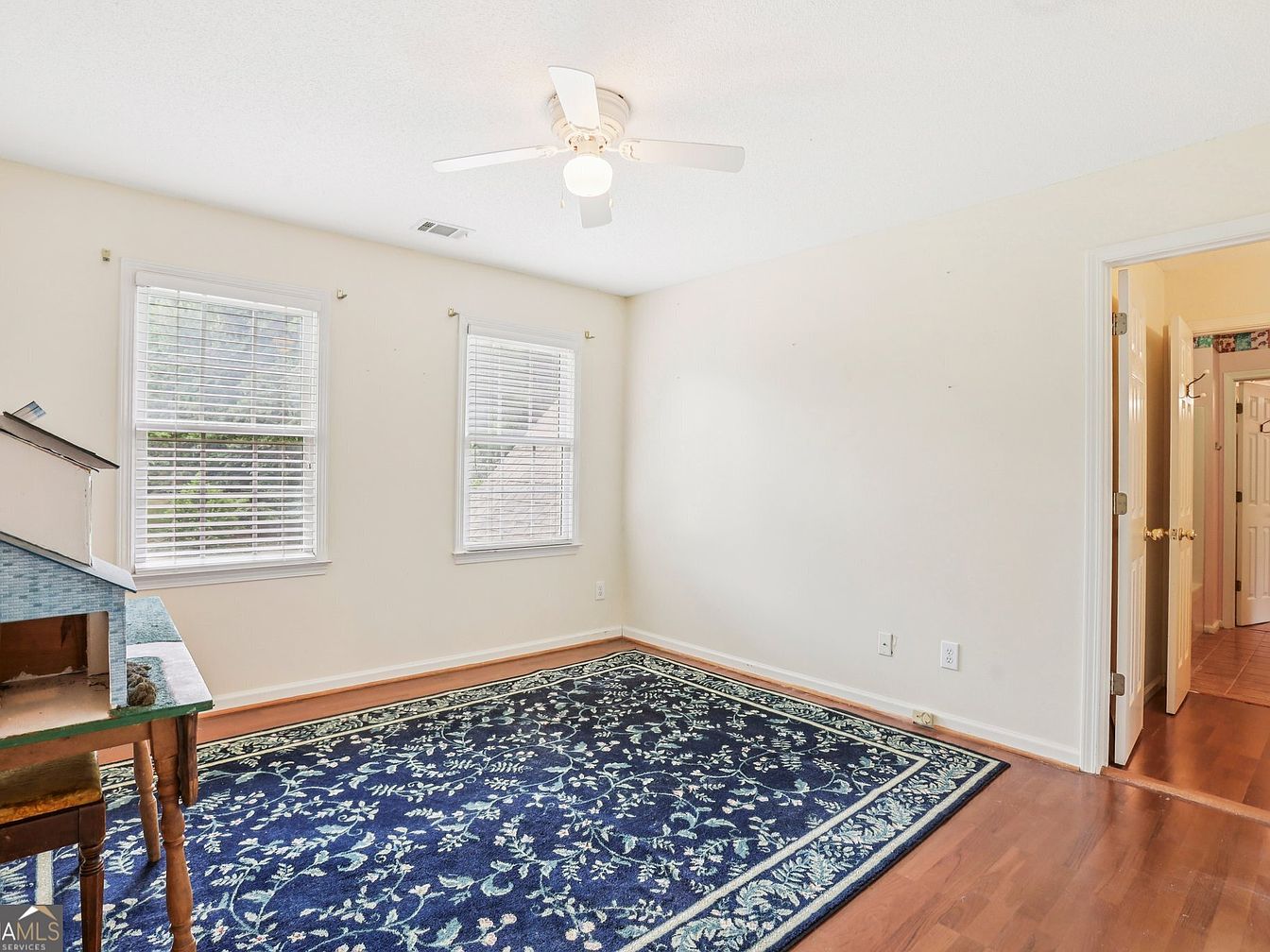 This quiet room features a simple, airy layout with two sizable windows allowing ample natural light to fill the space. The walls are painted a soft off-white that complements the warm wood flooring and white trim. A ceiling fan with a single light fixture provides practical illumination and airflow. The standout design element is a richly patterned blue area rug with floral motifs, adding a touch of elegance and color contrast. An inviting doorway opens toward other areas of the home, enhancing the room’s accessibility and flow. Its simplicity makes it versatile for use as a guest room, office, or creative space.