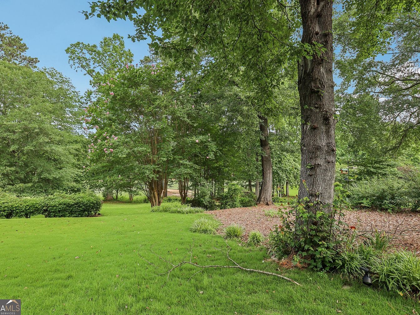 This serene backyard space features a lush green lawn bordered by mature trees and shrubs, creating a private and natural oasis. A mix of tall trees with textured bark lines the garden bed, which is mulched to prevent weeds and enhance moisture retention. Small decorative plants and ground cover add layers of greenery, while pink blossoms peek out from one tree, adding subtle color. The area is designed for tranquility and easy maintenance, with open grassy space for relaxation or activities and a backdrop of dense foliage that provides shade and a peaceful atmosphere.