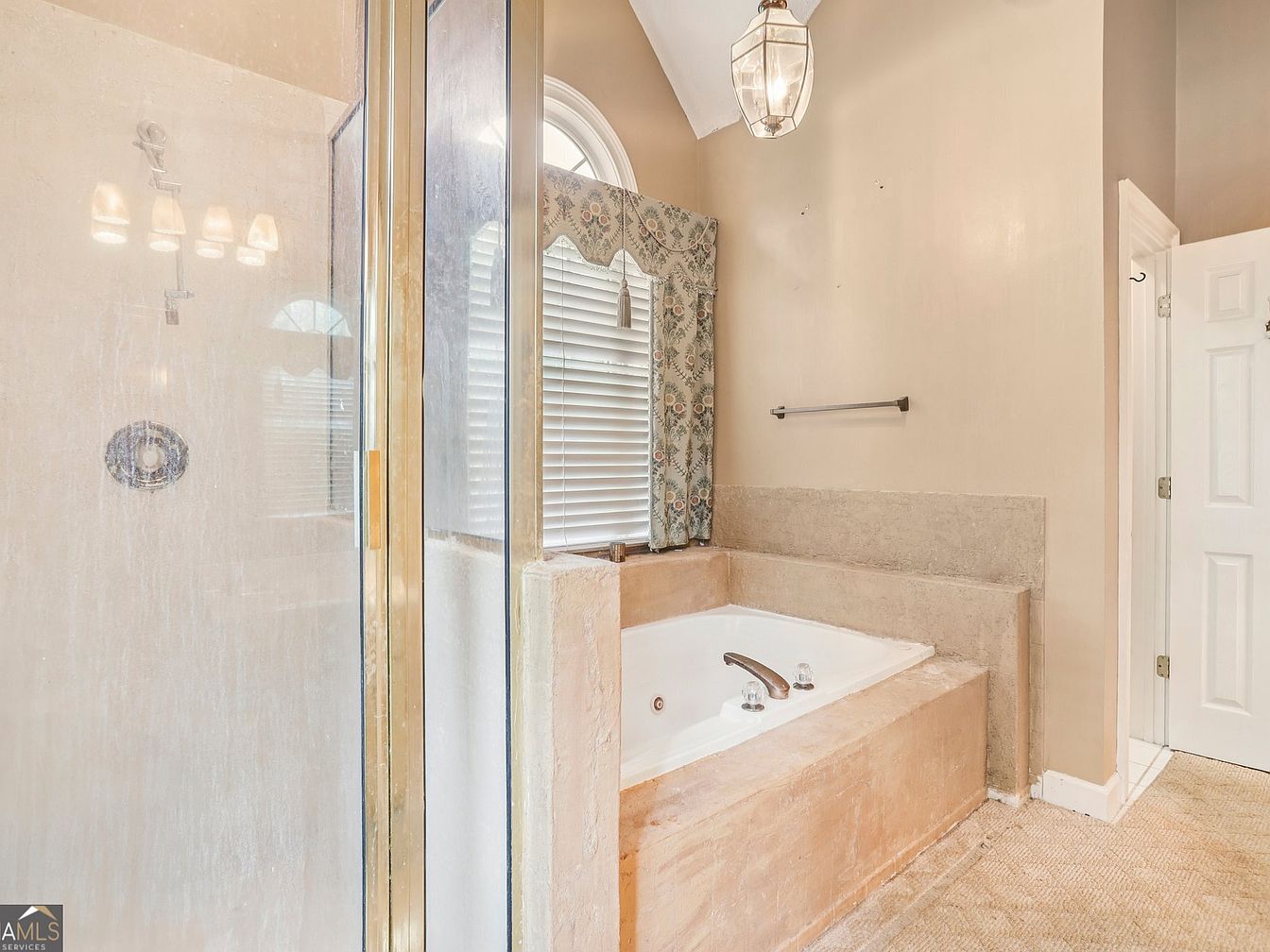 This bathroom features a built-in bathtub encased in a textured stone-like surround with neutral beige tones that complement the warm cream-colored walls. Adjacent to the tub is a glass-enclosed shower with gold-toned framing and hardware, adding a subtle touch of elegance. Above the tub, a large arched window with white plantation blinds is adorned with a floral-patterned valance in muted blues and soft reds, bringing a hint of traditional charm. A pendant light fixture hangs from the high ceiling, casting a gentle glow over the space. The floor is carpeted in a light beige, creating an unusual but cozy atmosphere for a bathroom. A towel bar mounted on the wall is positioned conveniently near the tub. Overall, the space marries classic design with comfort through its warm neutrals and soft decorative accents.