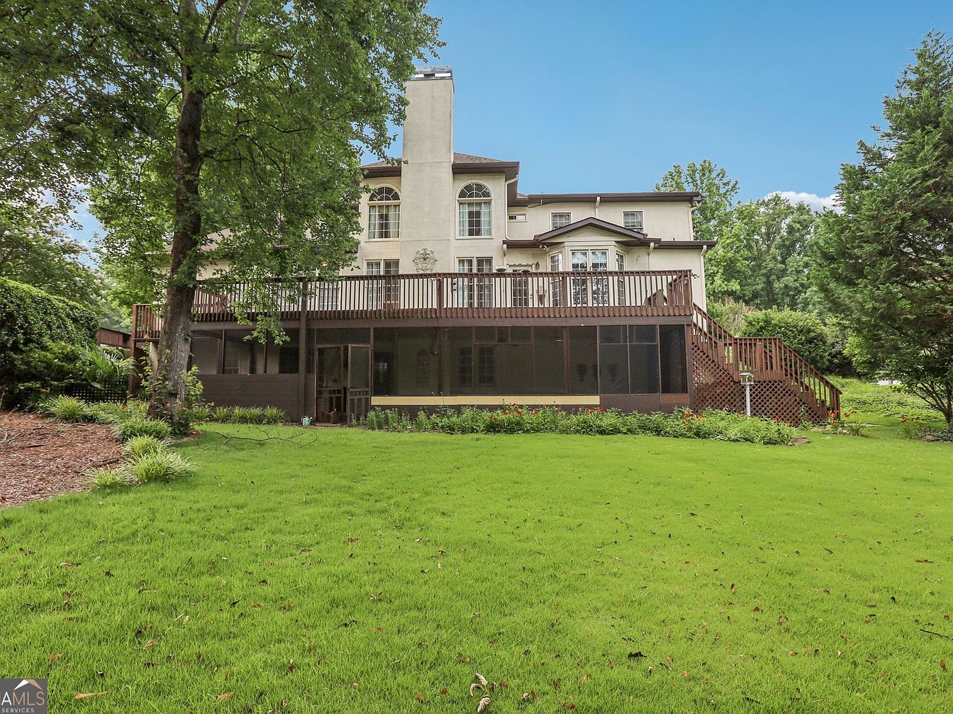 This expansive backyard showcases a lush, vibrant green lawn bordered by mature trees and well-maintained shrubbery, creating a serene natural setting. The home’s rear facade features a two-story design with large, arched windows that bring in ample light. A spacious wooden deck with railings spans the upper level, offering outdoor living space perfect for entertaining or relaxing. Below, a screened-in patio area provides sheltered outdoor enjoyment while maintaining a connection to the garden. Staircases on either side of the deck make access seamless between levels and the yard, blending functionality with classic architectural charm.