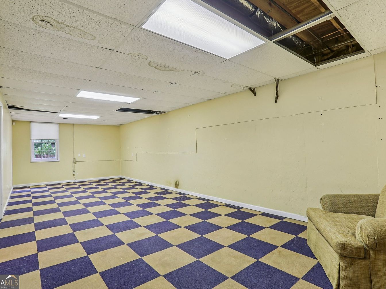 This basement area features a spacious rectangular layout with a distinctive black and beige checkered floor covering. The walls are painted a pale yellow, contributing a muted warmth despite some visible wear and damage. The drop ceiling uses white acoustic tiles, some of which are stained or missing, exposing the wooden joists and structural elements above. Fluorescent panel lights are integrated into the ceiling, providing bright, functional illumination. A small window with a white blind offers natural light at one end. An upholstered armchair in a faded green sits in the corner, hinting at some casual use in this unfinished space.
