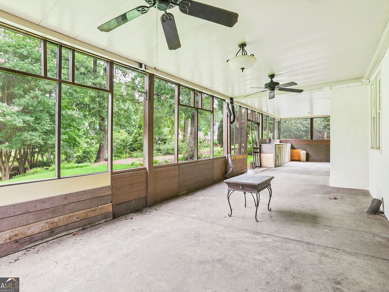 This spacious screened porch features a long, rectangular layout that invites an abundance of natural light through large windows framed with dark wooden trim. The lower half of the walls is clad in rustic wood panels, adding warmth and texture to the otherwise simple design. The white ceiling contrasts softly against the wood, and is fitted with two black ceiling fans to help maintain comfort during warmer days. The floor is plain concrete, providing easy upkeep. A small vintage-style metal-legged table sits centrally, accentuating the open, airy feel. The porch overlooks a lush garden, blurring indoor-outdoor boundaries for relaxation and casual gatherings.