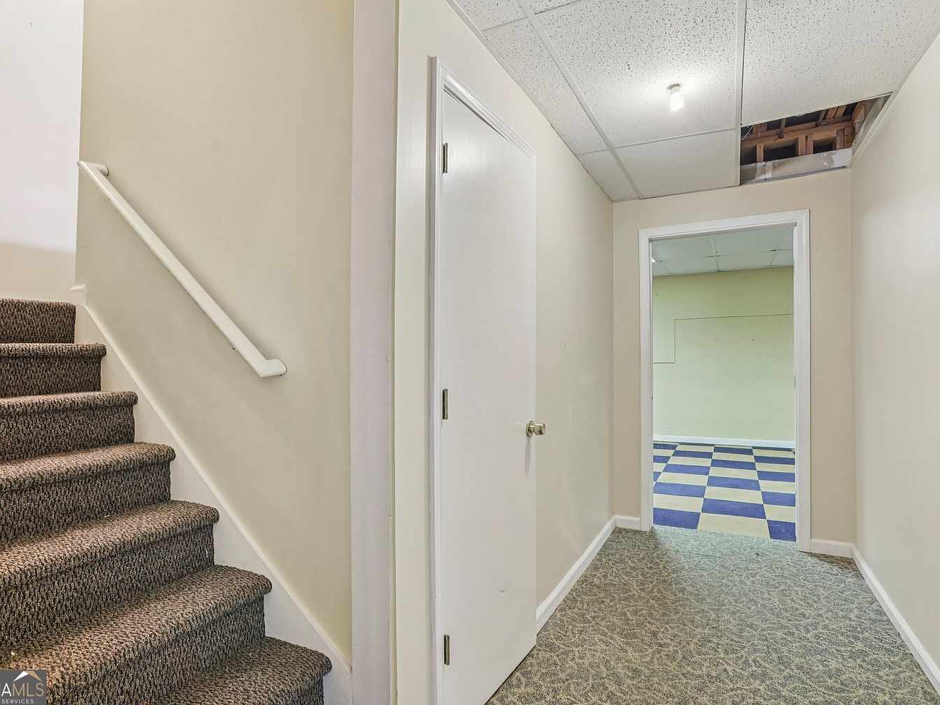This basement hallway features neutral beige walls paired with textured speckled carpet flooring that continues up the adjacent staircase. A white handrail lines the stairs for safety. The ceiling consists of standard drop ceiling tiles with one panel missing, revealing the ceiling joists above. A single ceiling light bulb provides illumination. A closed white door with brass hardware is set into the wall on one side, while an open doorway at the end reveals another room with bold blue and beige checkered flooring, creating contrast and visual interest in the lower level.