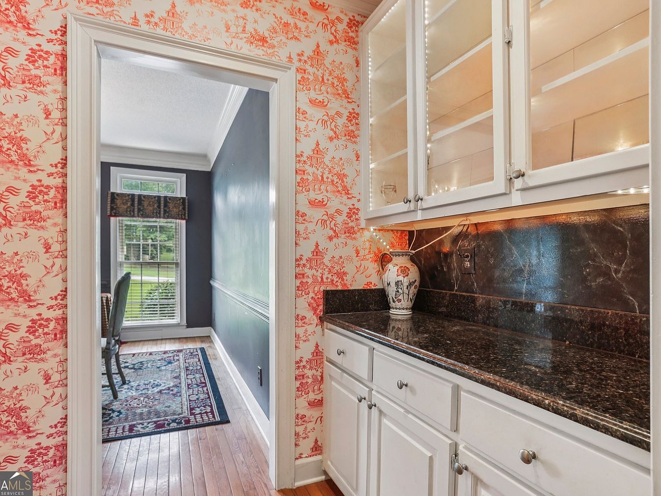 This compact butler’s pantry features elegant white cabinetry with glass-front upper cupboards, illuminated by soft accent lighting, highlighting the dark granite countertop and backsplash. The rich, polished stone contrasts beautifully with the delicate white woodwork. The wallpaper showcases a vibrant red and white toile pattern with classic pastoral scenes, lending a nostalgic charm to the space. Visible through the doorway, a glimpse into the adjacent dining room reveals navy blue walls, a large window with a decorative valance, and a traditional rug adding warmth and depth to the home’s refined atmosphere.