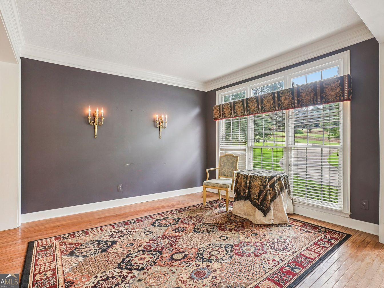 This cozy corner features a rich, muted charcoal wall that contrasts elegantly with the bright white crown molding and window trim. The hardwood floor pairs with a large, ornate area rug showcasing intricate patterns in warm reds, creams, and blues, adding a classic touch. A small table draped in a matching dark, decorative cloth sits beside a vintage-style armchair upholstered in soft, muted tones. Two antique brass wall sconces with candle-style bulbs add a warm glow and old-world charm to the space, while the large window with white blinds and a patterned valance provides ample natural light and views of the greenery outside.