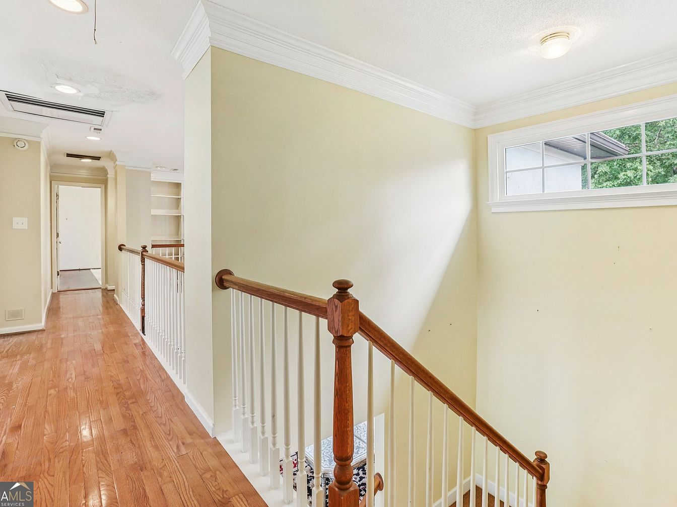 This upstairs hallway features warm hardwood floors that extend throughout the space, complemented by cream-colored walls enhanced with bright white crown molding and baseboards. The stair railing combines rich wood handrails with white spindles, offering a classic yet clean contrast. Natural light gently pours in through a wide, horizontally oriented window, adding brightness and a view of greenery outside. The layout leads toward a doorway at the end of the hall, while built-in shelves peek from around the corner, indicating a practical and open flow between rooms. Simple ceiling fixtures provide additional light.