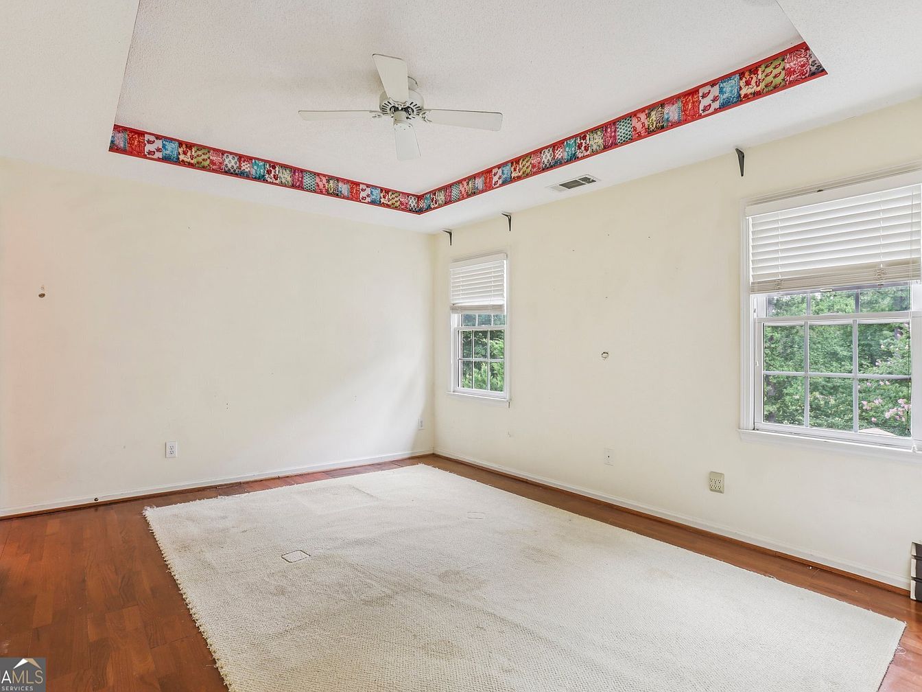 This corner of the bedroom features a simple layout with light beige walls and polished wooden flooring. A large, off-white area rug anchors the space, showing slight wear. Two sizable windows with white blinds allow natural light to brighten the room while offering views of greenery outdoors. The white ceiling includes a sunken design bordered by a vibrant, patchwork-style wallpaper strip, adding a splash of color and character to the otherwise neutral tones. A white ceiling fan hangs centrally, contributing to the room’s functional comfort. Small hooks and mounting brackets suggest previous wall hangings or shelving.