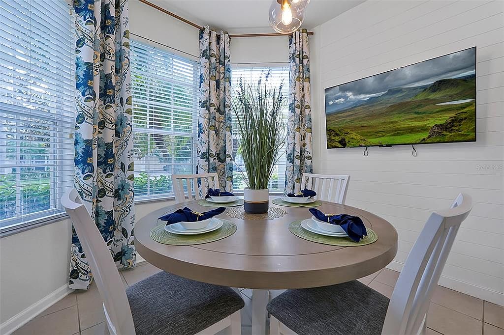 This cozy breakfast nook features a round wooden table with a modern design, surrounded by four white chairs with dark upholstered seats for contrast. The area is framed by large windows that allow natural light to flood the space, enhanced by white plantation blinds and blue floral-patterned curtains adding a touch of color and pattern. The white shiplap wall hosts a large flat-screen TV displaying a serene landscape scene, complementing the tranquil vibe. Centered on the table is a tall, green potted plant that adds a touch of nature to the minimalist, fresh atmosphere.