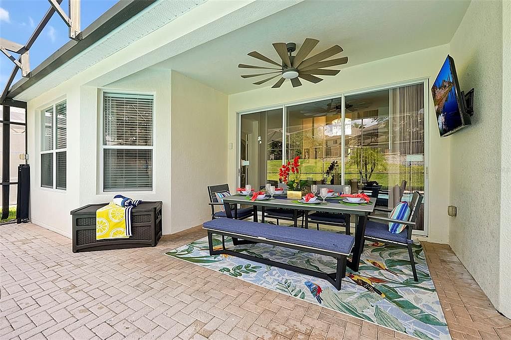 This covered patio space is designed for outdoor dining and relaxation, featuring a rectangular dining table with a mix of seating including a bench and chairs with blue cushions. The area is anchored by a colorful rug adorned with botanical and bird motifs, adding lively accents to the neutral stone-tiled floor. Walls are painted a soft off-white, complimenting the airy, open feel. A modern, large ceiling fan with broad blades is mounted above the dining set for comfort. Sliding glass doors open to the interior, while a mounted flat-screen TV offers entertainment. A small storage chest is tucked against the wall, topped with a bright yellow towel, enhancing the inviting atmosphere.