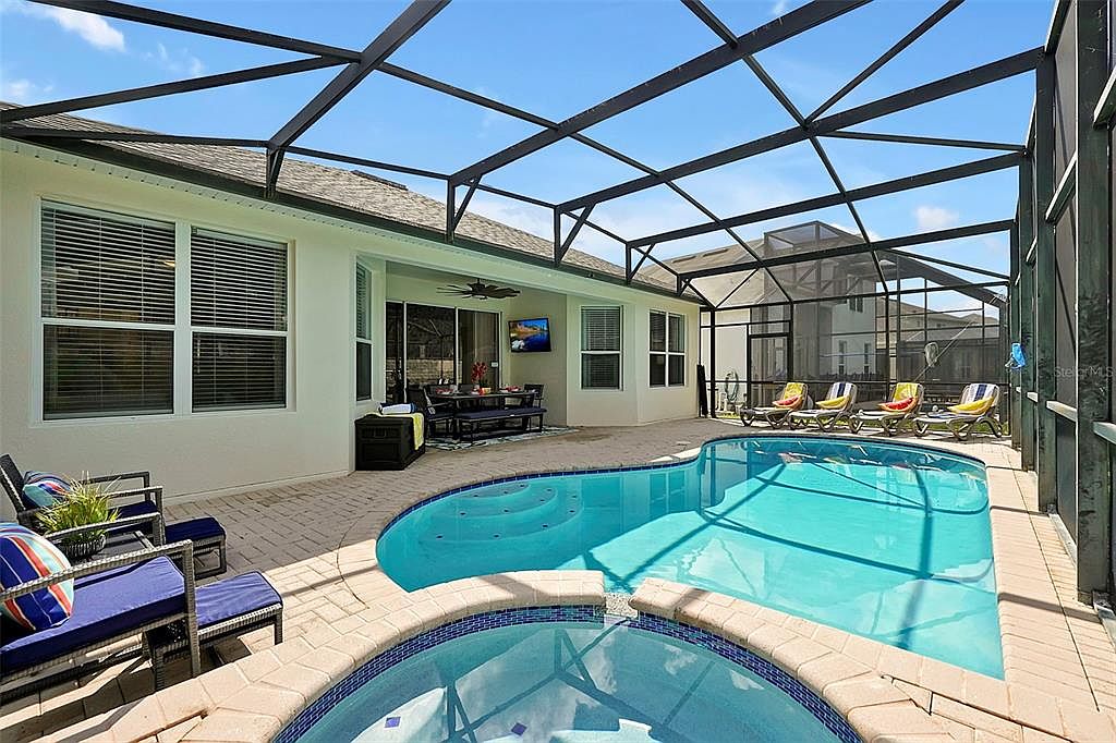 This outdoor space features a screened enclosure that allows for an airy, sunlit atmosphere while providing protection from insects. The focal point is a clear, blue swimming pool with a connected rounded spa bordered by light-colored pavers. Alongside the pool, multiple cushioned lounge chairs provide a relaxing spot, with colorful pillows adding a cheerful, beachy vibe. Adjacent to the house, there is a covered seating area with a dining table and chairs, plus a wall-mounted TV, offering a perfect blend of leisure and entertainment. Neutral wall tones and black framed screen enclosure create a balanced, modern aesthetic.