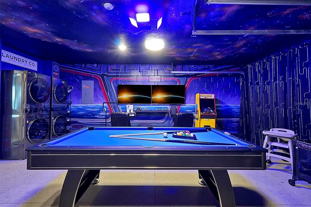 This space combines entertainment and utility, featuring a sleek black pool table with a blue felt top centrally placed under soft overhead lighting. Along one wall, a set of modern stainless steel washers and dryers are neatly stacked, indicating a laundry area. The walls and ceiling are creatively painted with a cosmic, space-themed mural in deep blues and purples, enhancing the room’s futuristic vibe. Two large flat screens are mounted on the far wall beside a classic yellow Pac-Man arcade game, while two office chairs sit in a gaming or work setup. The room balances fun, practical use, and sci-fi aesthetics beautifully.