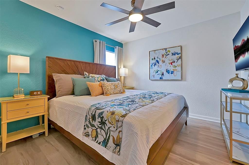 This bedroom features a calming color palette, with a bold teal accent wall behind a modern wooden headboard that adds warmth and texture. Complementing the teal, soft off-white walls brighten the room, while light wood flooring enhances its airy feel. A pair of yellow nightstands with lamps provide balance and subtle pops of color. The bed is adorned with neutral bedding layered with a floral runner and assorted decorative pillows that introduce blues, greens, and yellows. A sleek ceiling fan with light, a minimalist side table, and abstract art complete this soothing and inviting retreat.