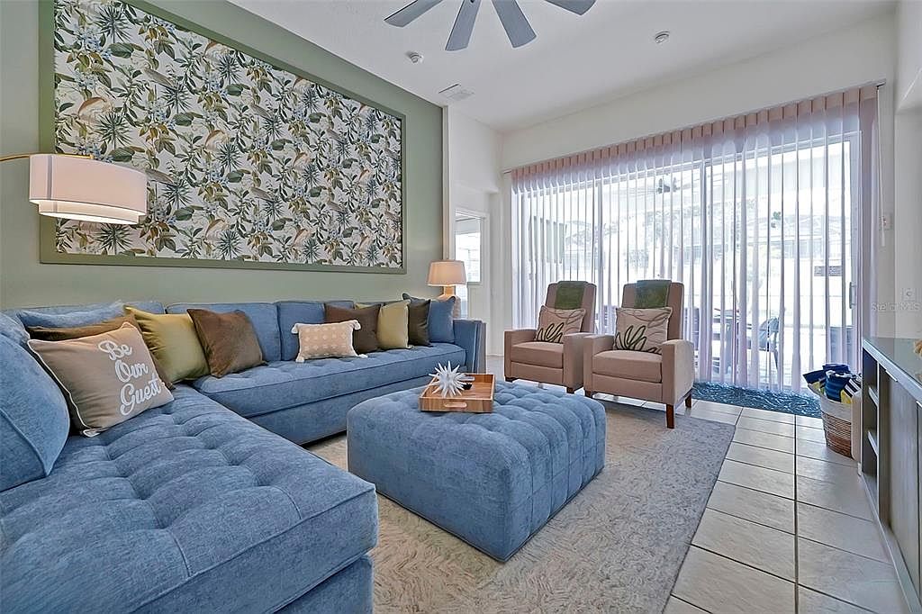 This cozy living room showcases a spacious sectional sofa upholstered in a soothing blue fabric, complemented by a large matching ottoman in the center, providing ample seating and comfort. The accent wall behind the sofa is painted a soft green and features a large framed botanical print, adding a natural, tranquil element to the space. Two beige armchairs with decorative pillows sit adjacent to the sliding glass doors, which are covered with vertical blinds, allowing natural light to flow in while maintaining privacy. The neutral tile flooring is softened by a light-colored textured area rug, enhancing the inviting ambiance. Subtle decorative touches, including throw pillows in earth tones and a modern floor lamp, complete the harmonious and elegant aesthetic.